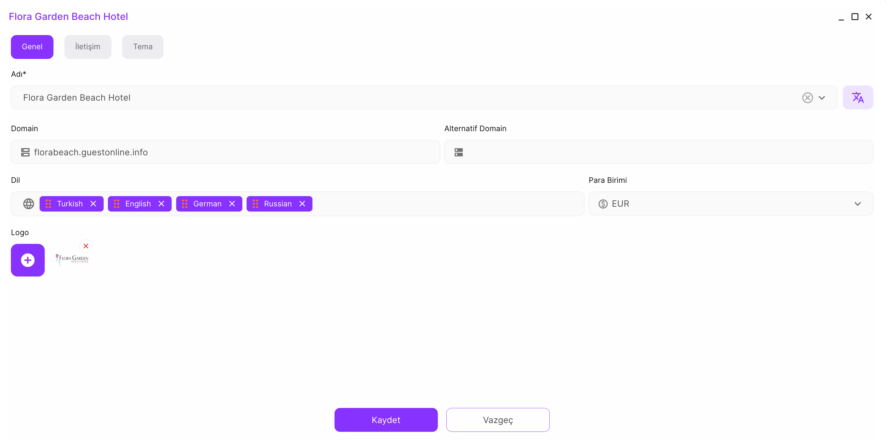 Genel kısmından diller, logo, para birimi düzenlenebilir.