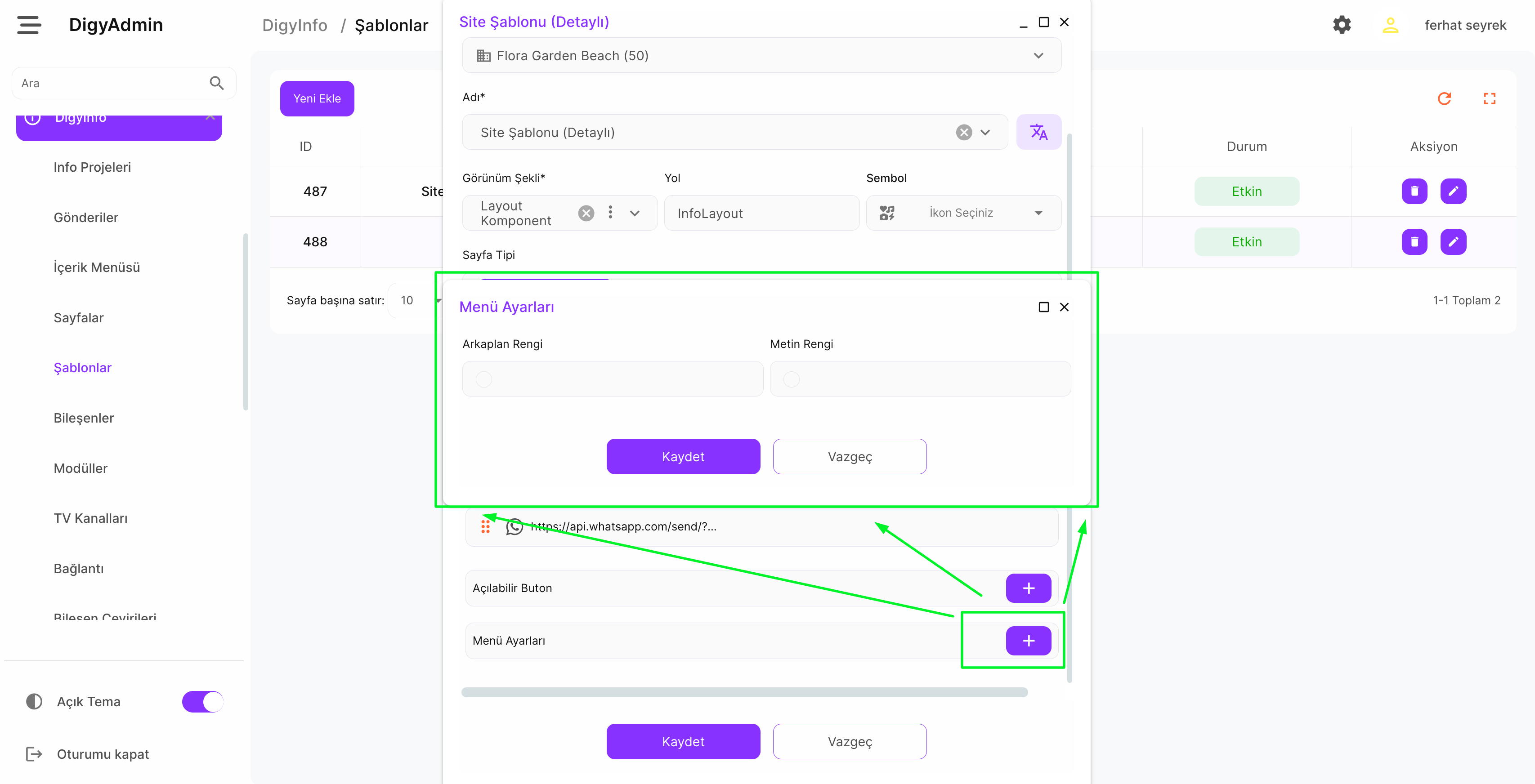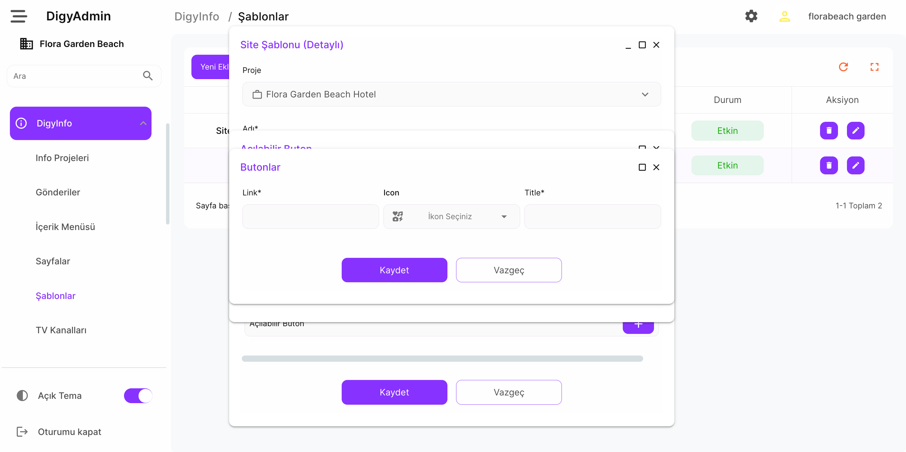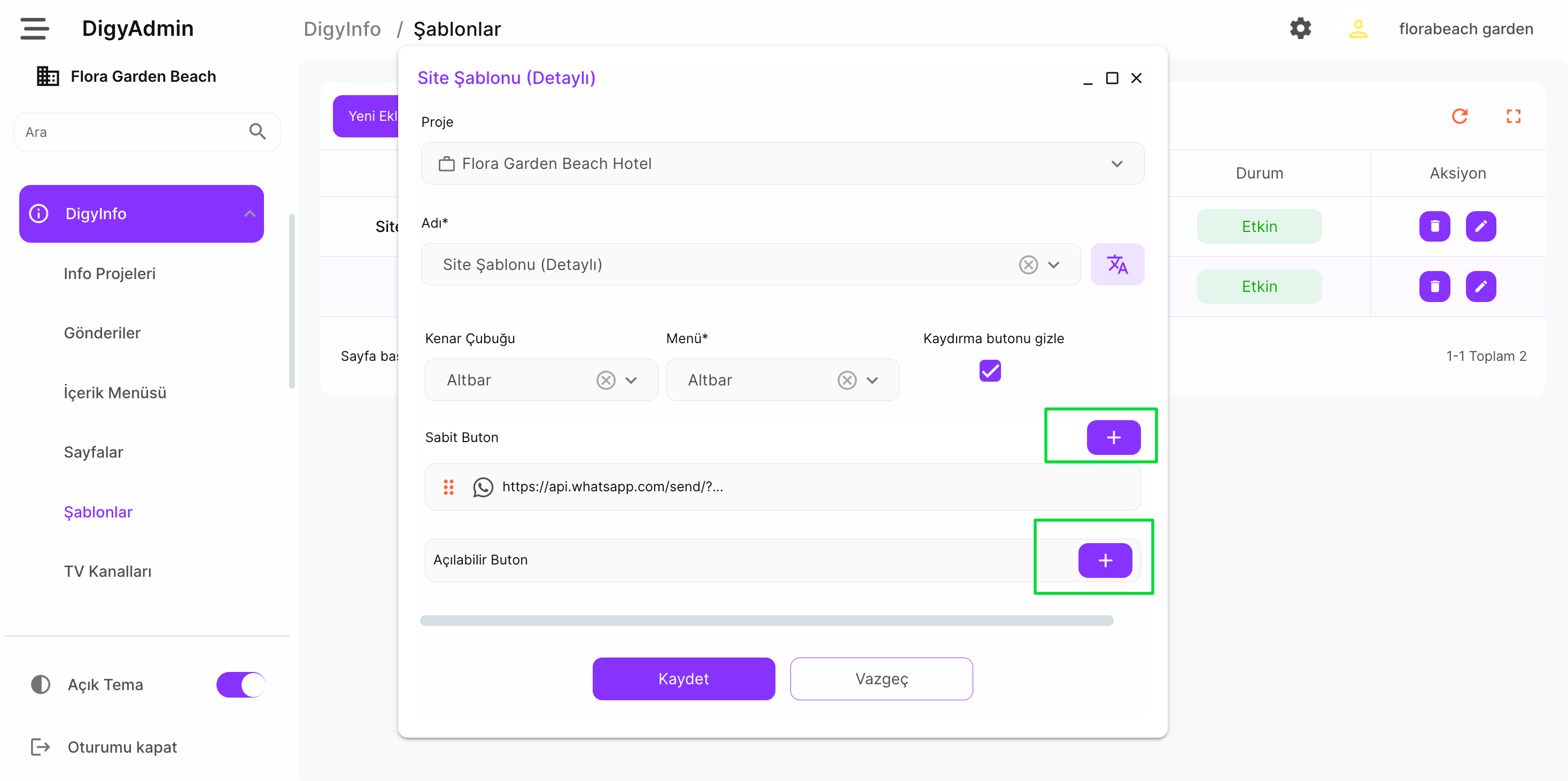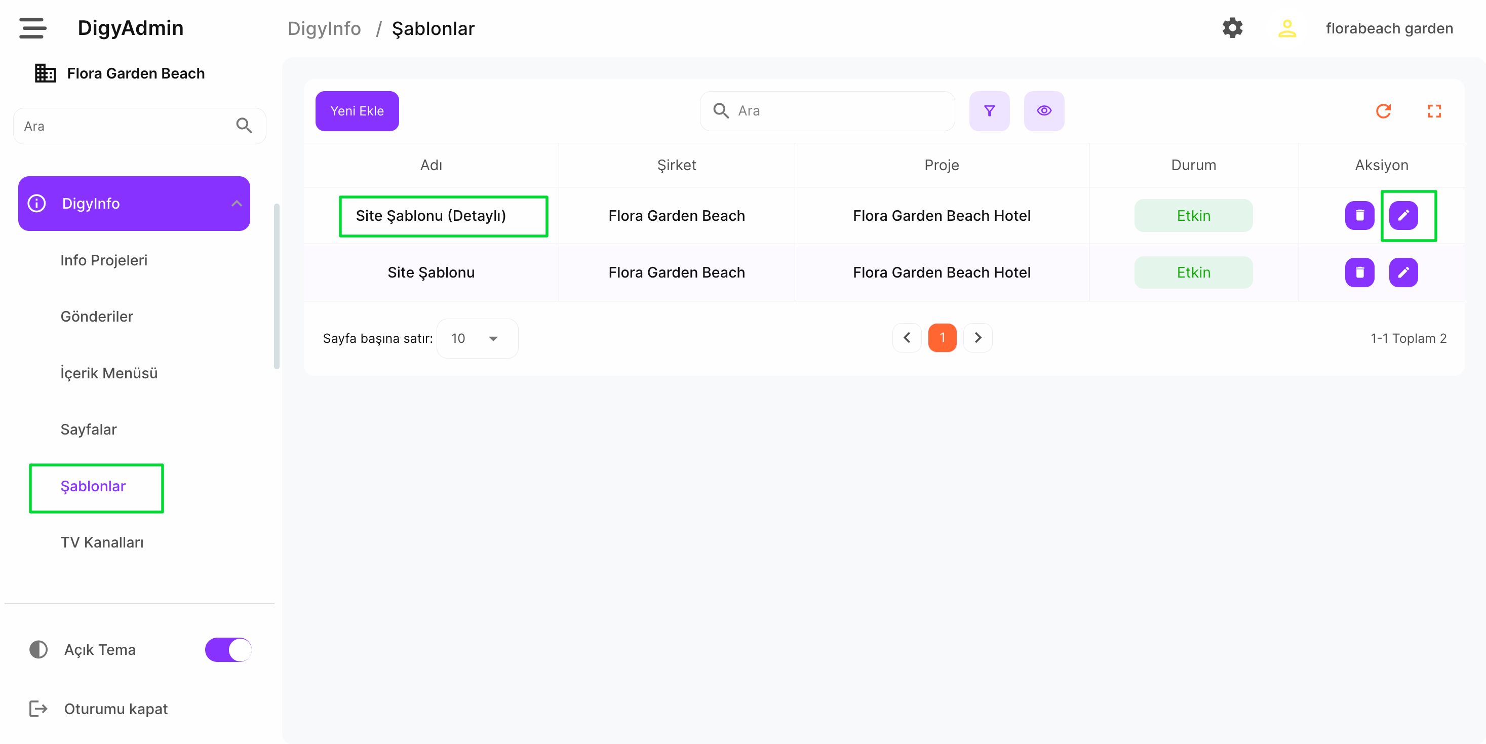 DigyInfo altında şablonlar kısmına gelinir ve Site Şablonu (Detaylı) olanda düzenle butonuna basılır.