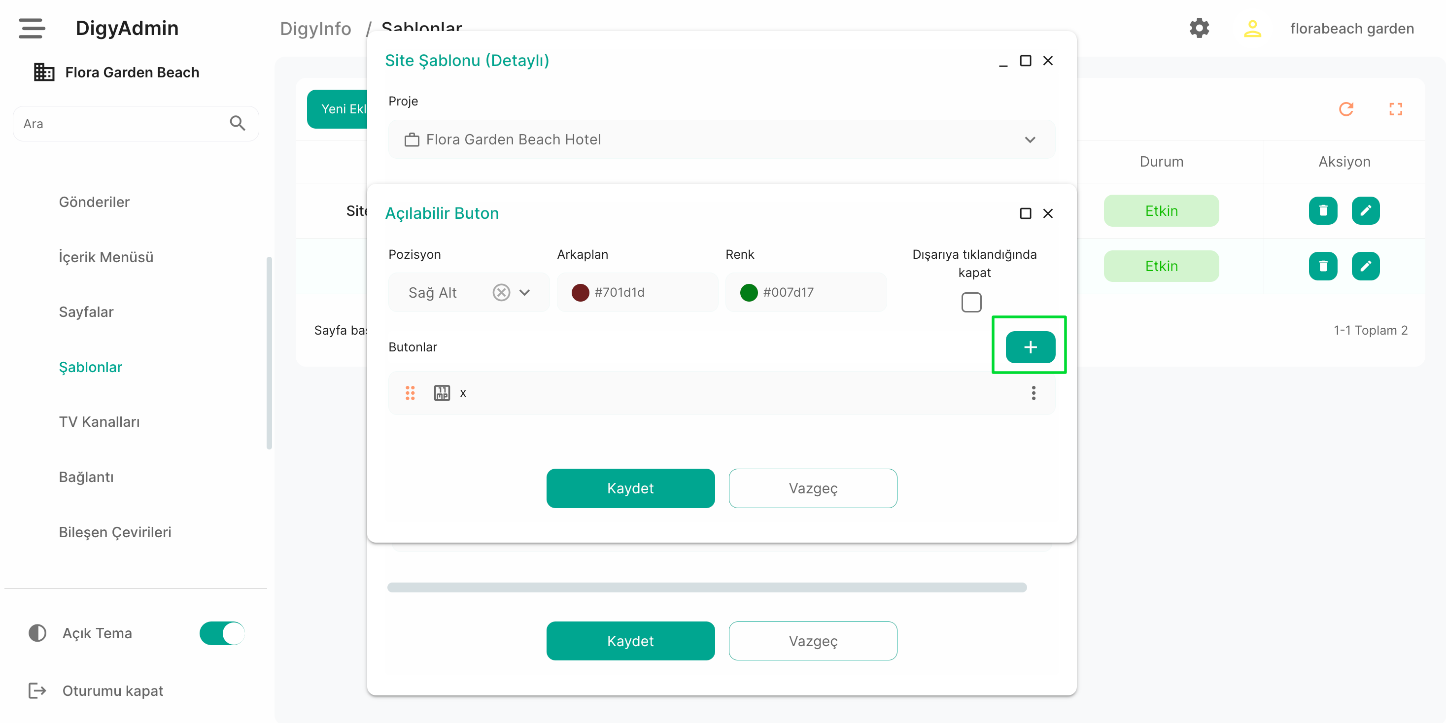 Açılabilir buton eklenme istenirse '+' butonuna basıldıktan sonra bu sayfa açılır. Buradan açılabilir butonun konumu seçilir ve renkleri belirlenir. Ardından tekrar '+' butonuna basılır.