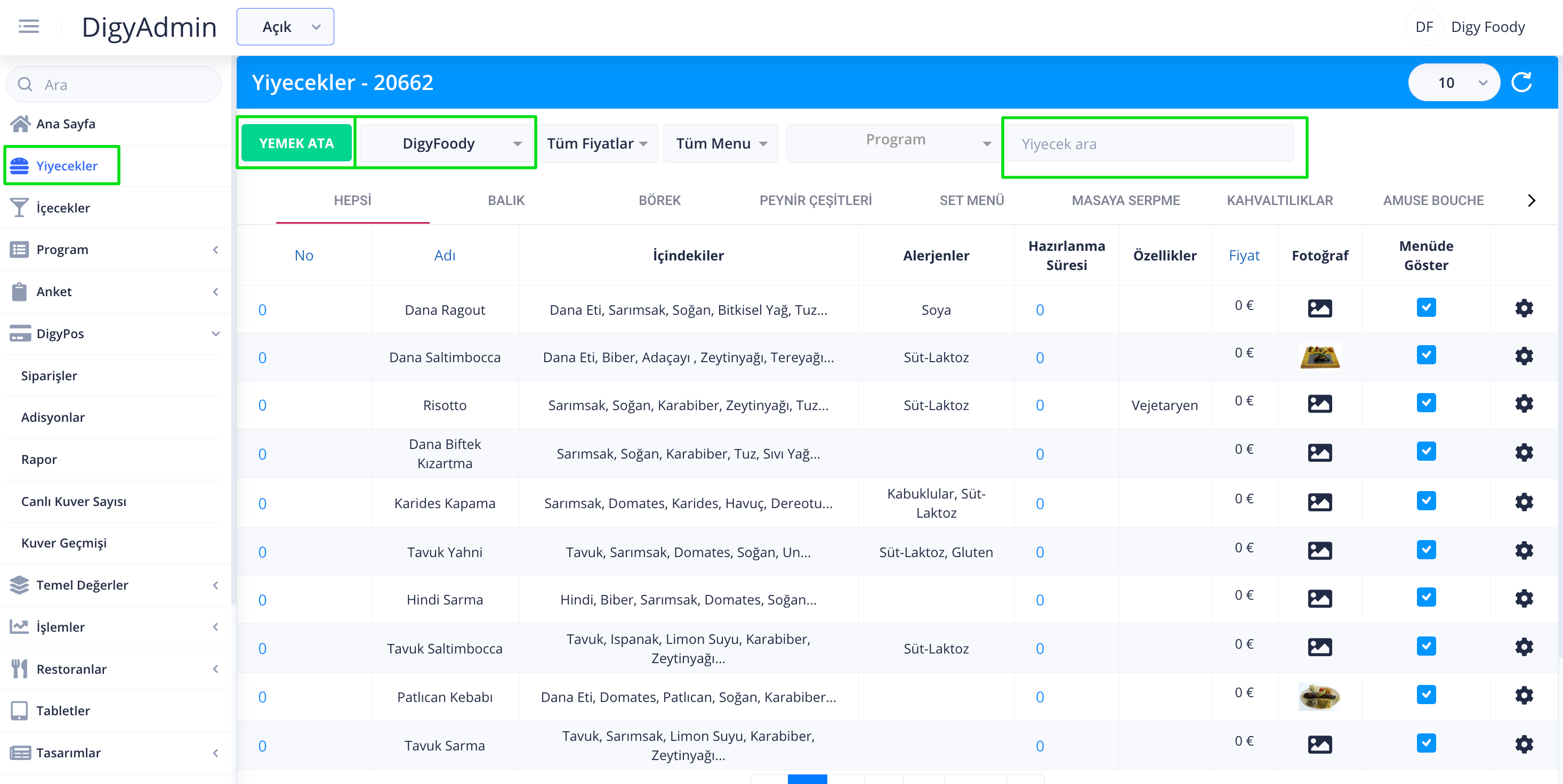 Yemek arama için sol kısımda yiyeceklere gelinir DigyFoody yazan kısımdan aranılmak istenen restoran seçilir ve arama kutusundan yemek aratılır. Sol kısımda yiyecekler altındaki içecekler bölümü de benzer mantıkta çalışmaktadır.