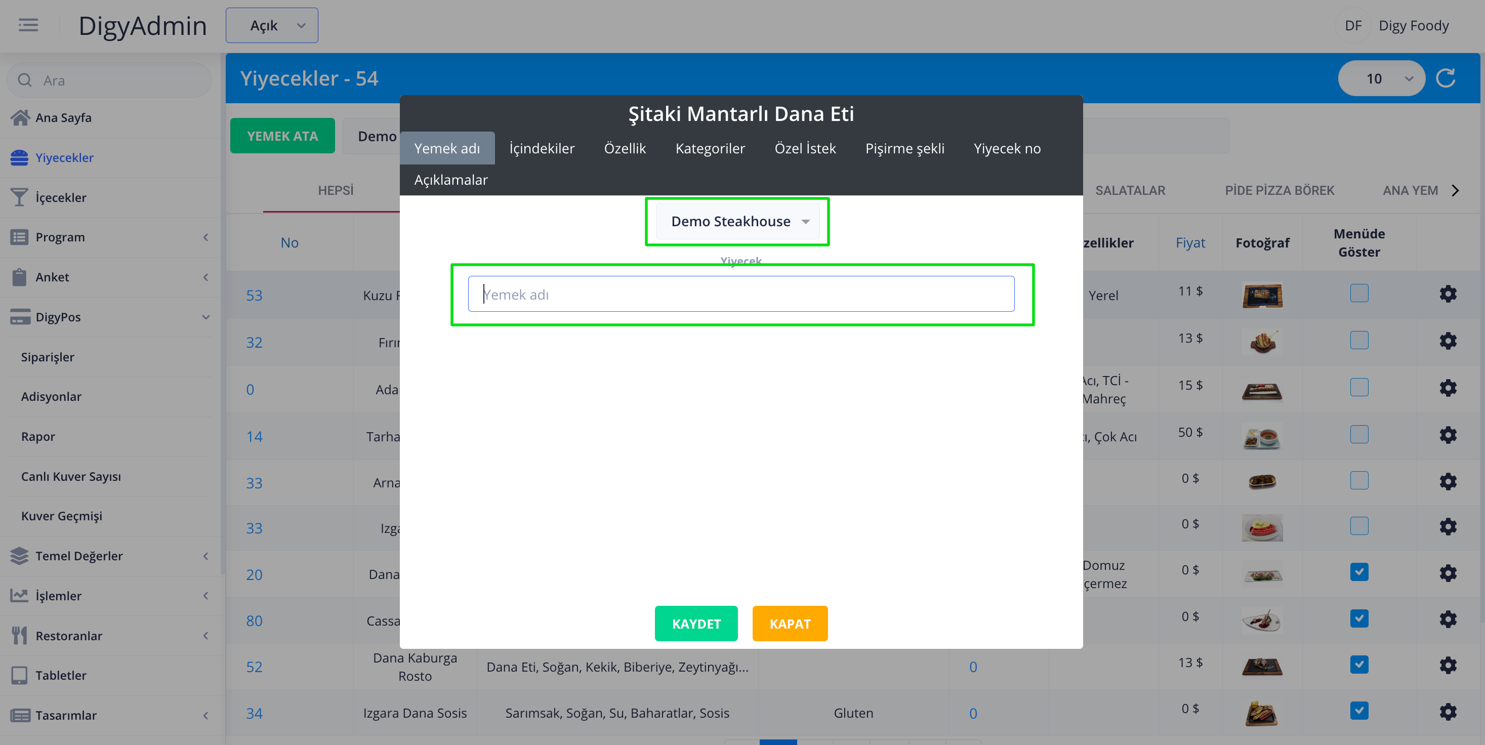 Yemek atama butonuna basıldıktan sonra eklenecek restoran seçilir ve ardından yiyecek kutusundan eklenmek istenen yemek aratılır ve seçilir. ardından üst kısımdaki sekmelerden yiyeceğe özel nitelikler ve özellikler seçilir.