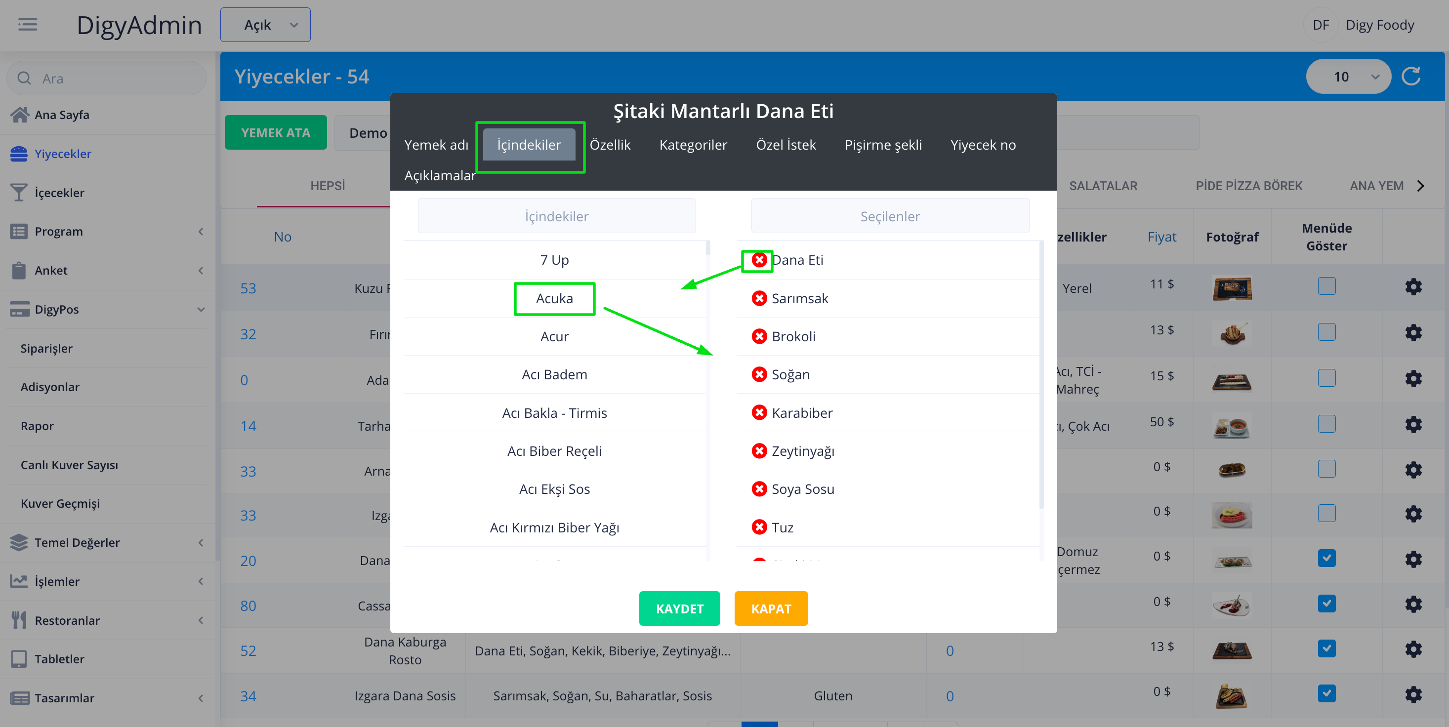 Seçilen yiyeceğe özel varsayılan nitelikler hazır olarak gelmektedir bunlara ek ekleme ve çıkarma işlemi yapılacaksa sol kısımdan istenen özellik seçilir ve sağ kısımdaki seçilenler kısmına aktarılır. Seçilenlerde bir içerik çıkarılmak isteniyorsa kırmızı çarpı butonuna basılır üst kısımdaki diğer sekmeler de aynı mantıkta çalışmaktadır.