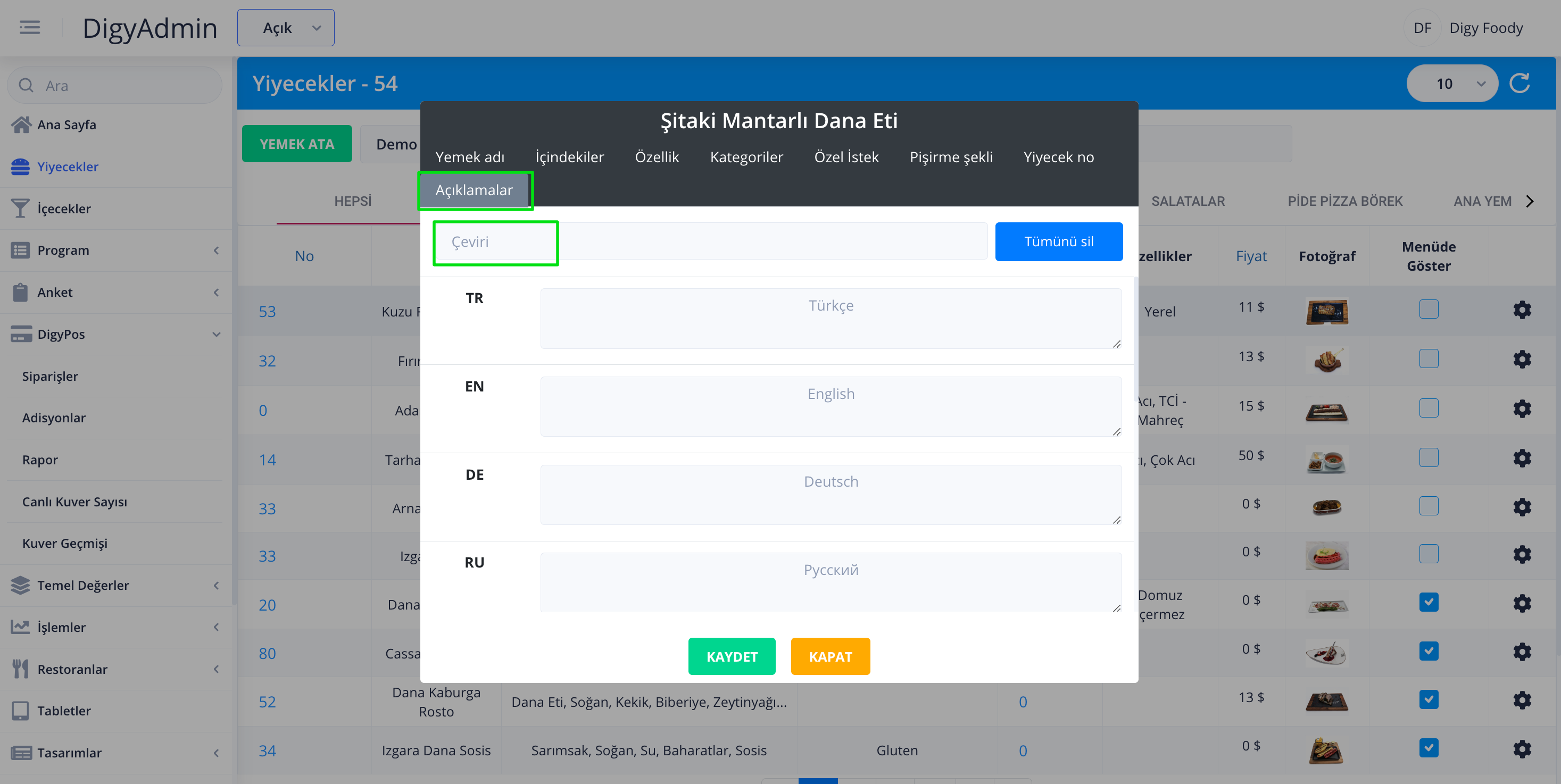 Açıklamalar kısmında opsiyonel olarak yiyeceğe açıklama yazılabilir. Çeviri yazan bölümde kayıtlı açıklamalardan seçim yapılabilir ya da manuel olarak diğer dillerdeki çevirileriyle birlikte açıklama eklenebilir.