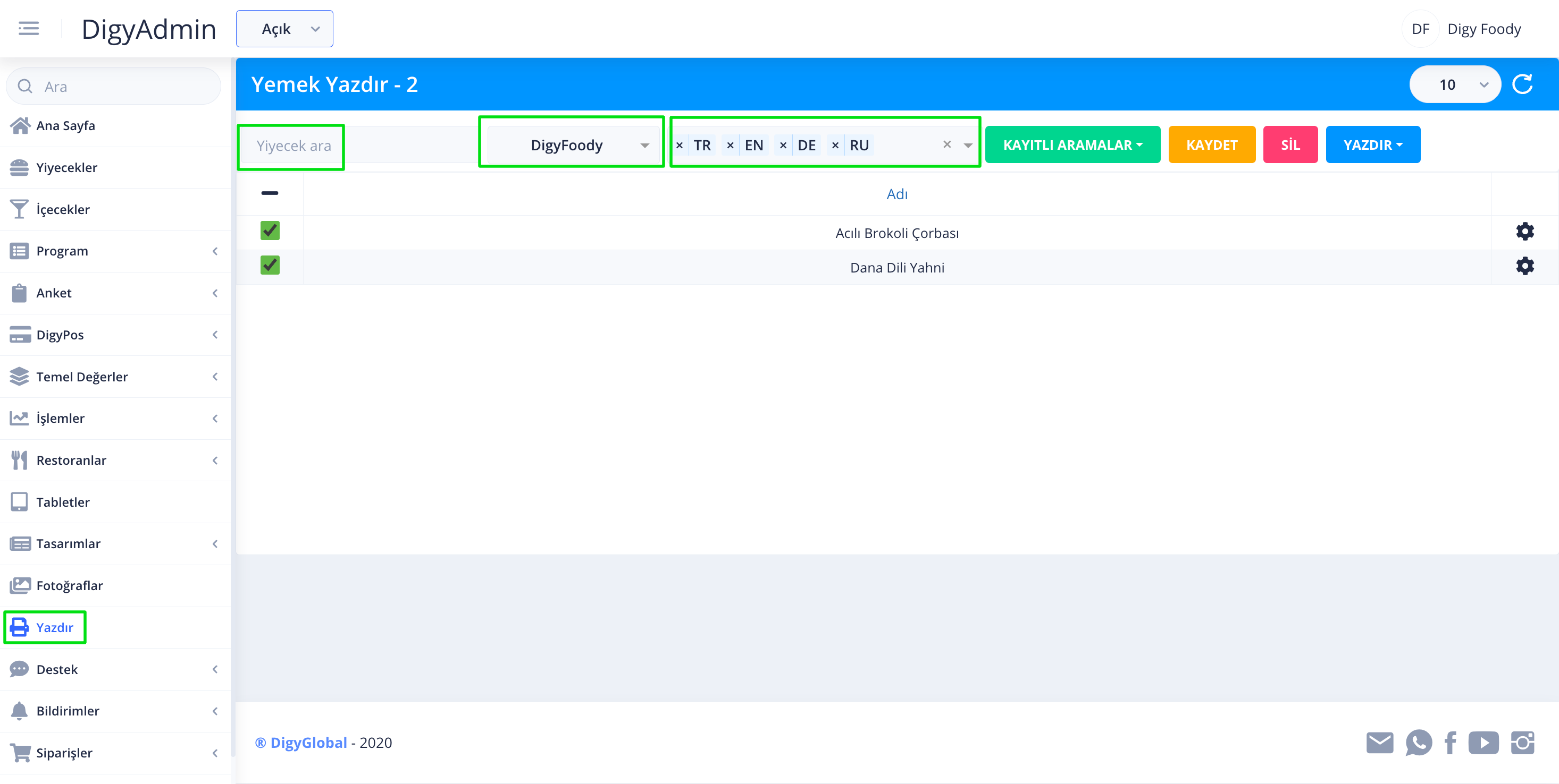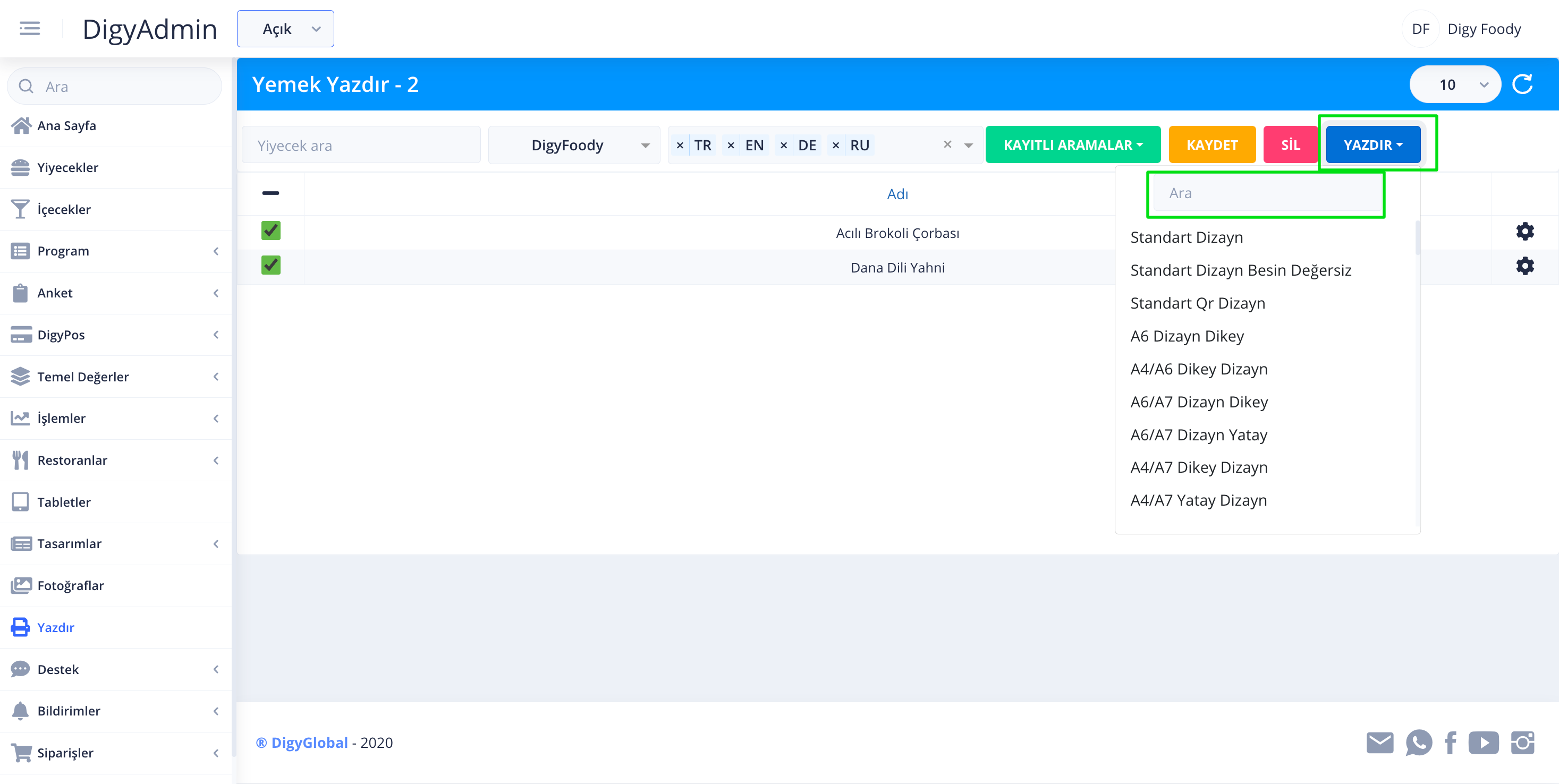 Yemek yazdırma için sol taraftan yazdır kısmına gelinir. Yiyecek ara kısmından arama yapılır ve seçilir. Seçilen yemek alt kısımda gözükür. Ardınan yanındaki kutudan restoran seçilir. Diller bölümünde dil eklenip çıkarılabilir. Dillerin sıralamasını değiştirmek için tüm diller kaldırılır ve hangi sırayla gösterilmek isteniyorsa o sıraya göre seçim yapılır.