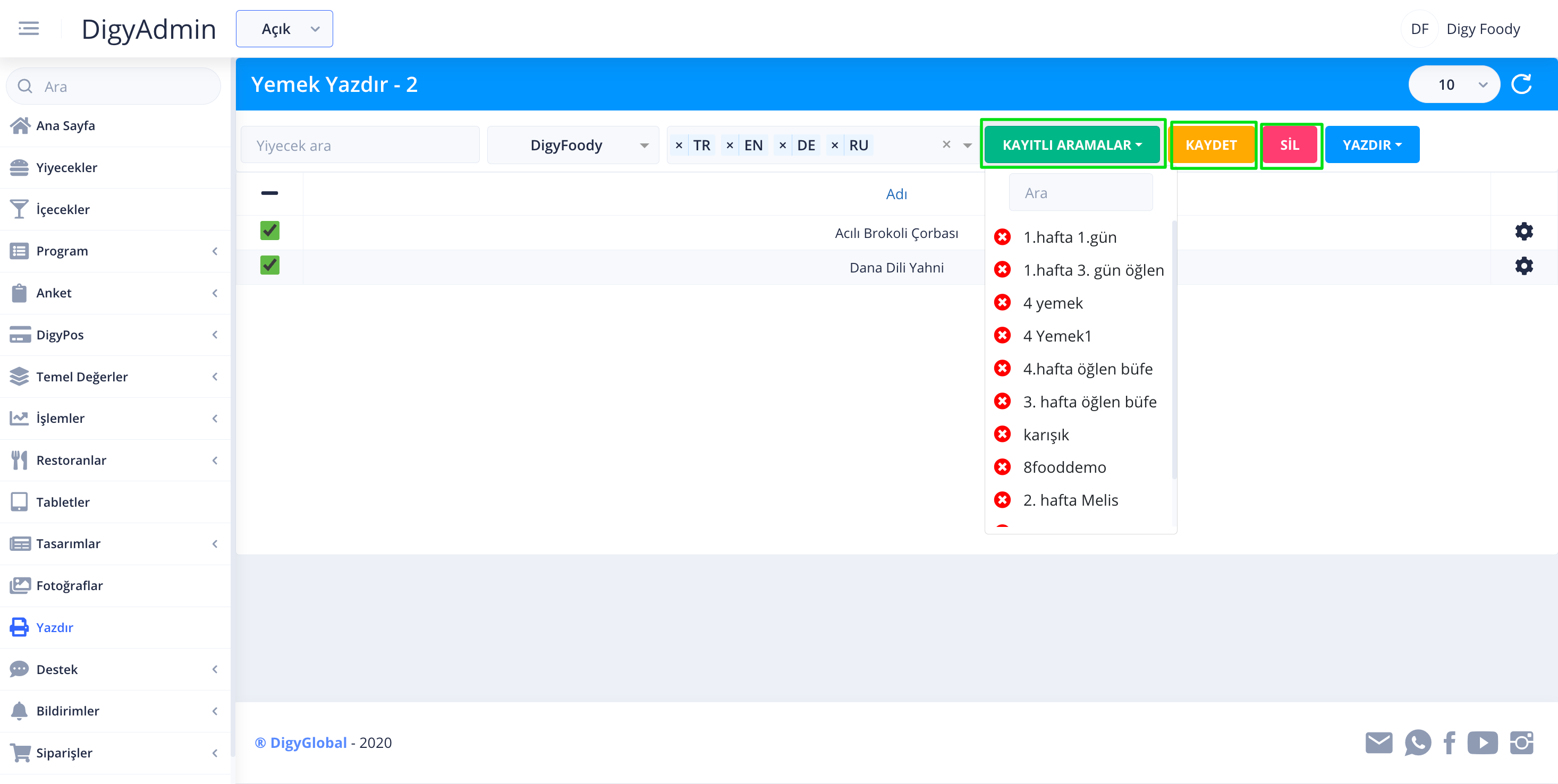 Yazdırılmak için oluşturulan liste daha sonra kullanılmak amacıyla kaydet denilip kaydedilebilir veya silinebilir. Kayıtlı aramalardan ise kaydedilen yemek listeleri seçilebilir.