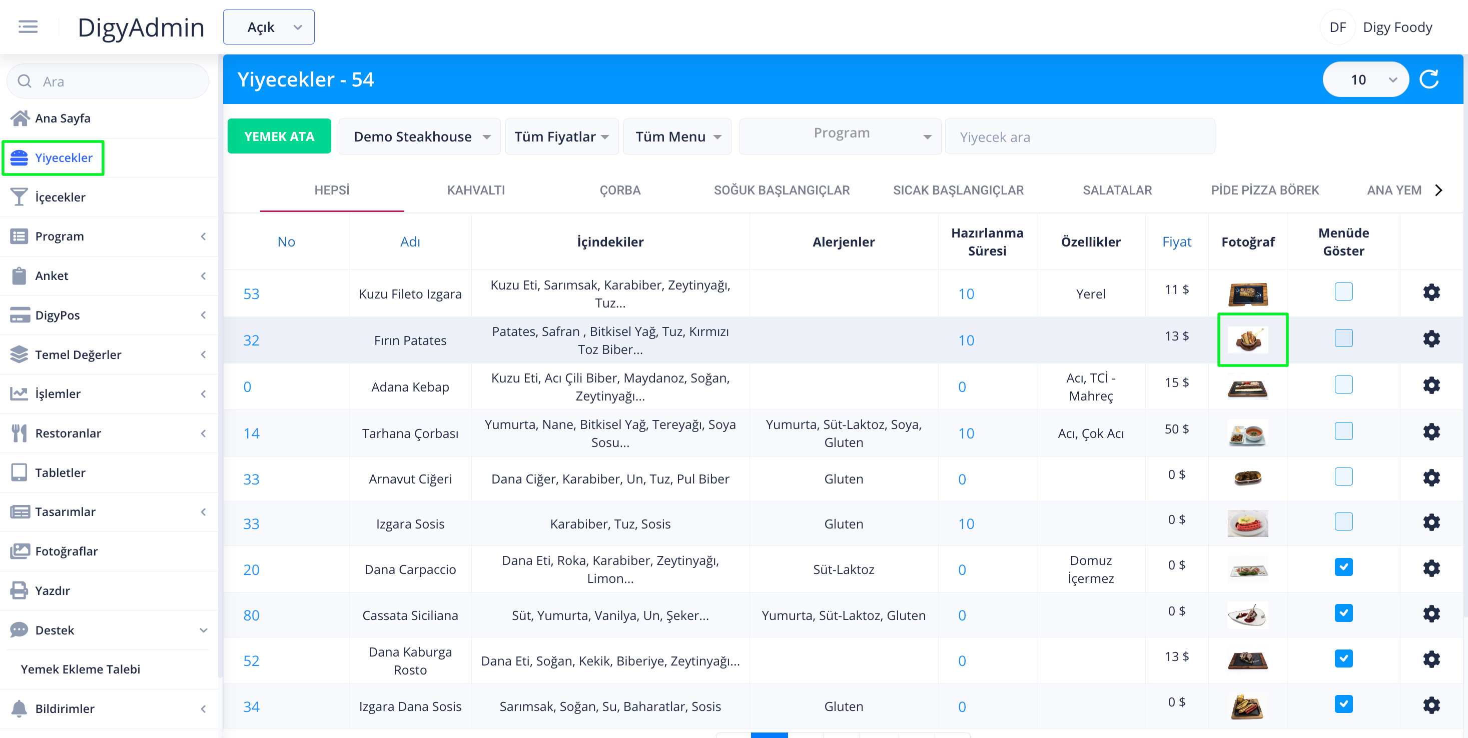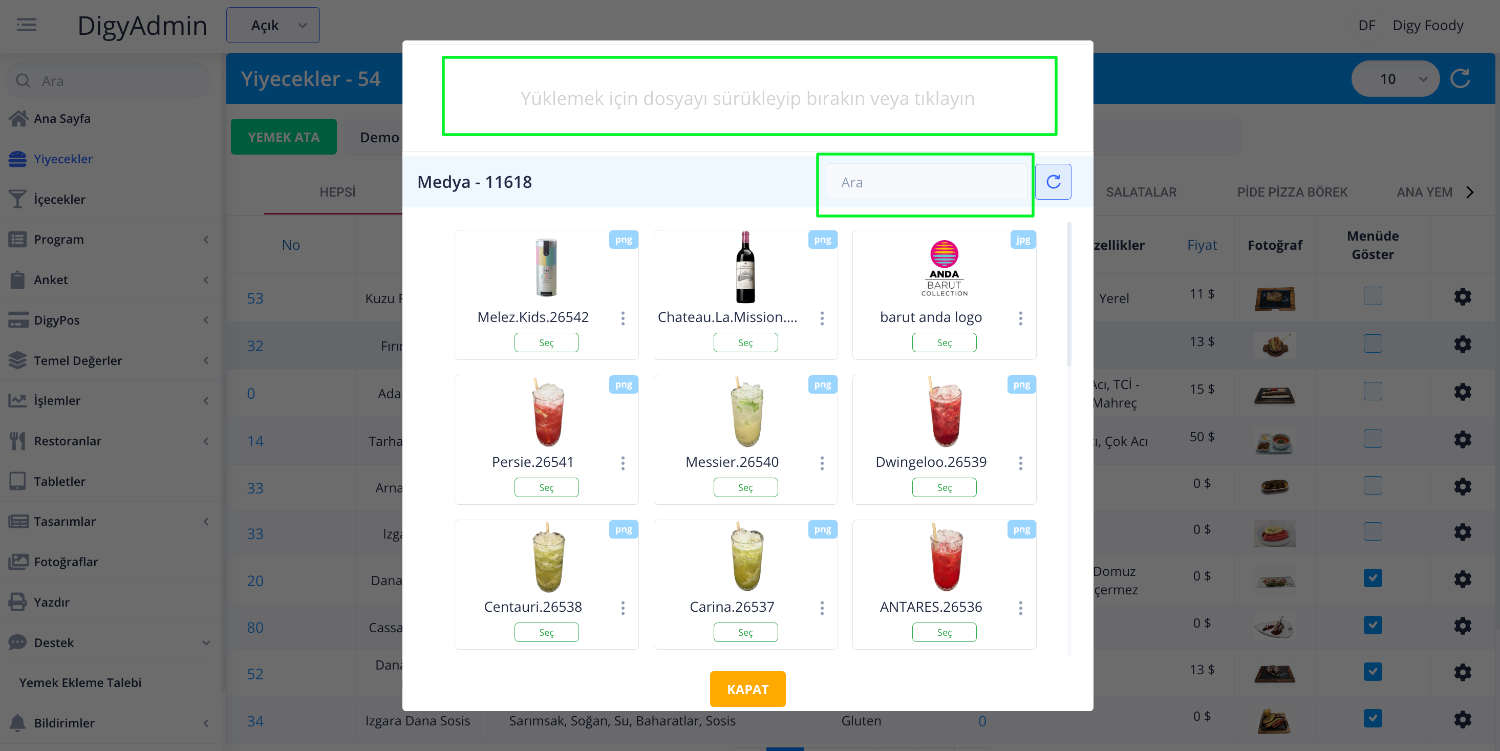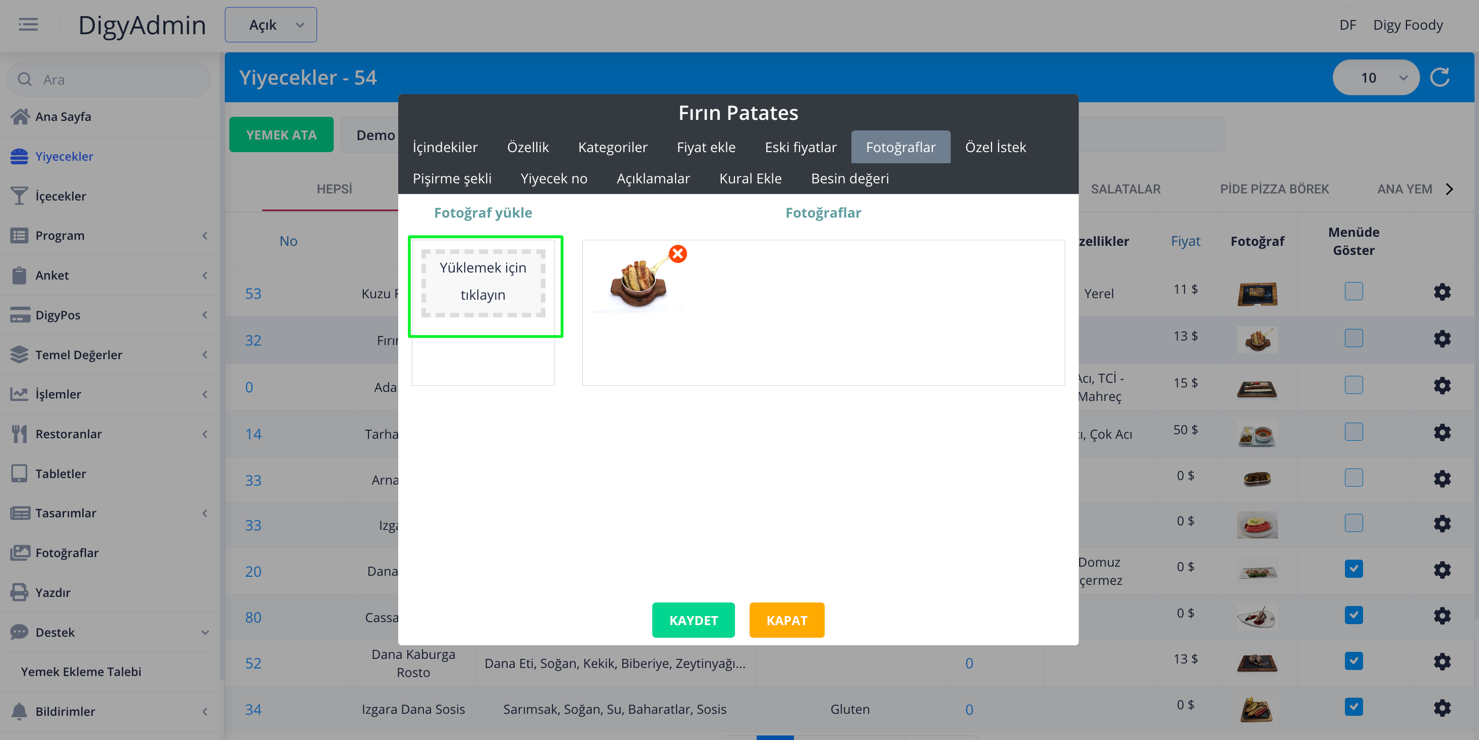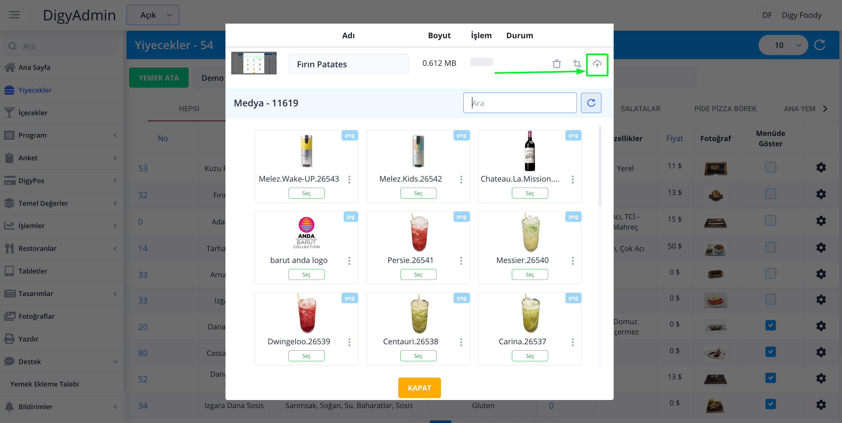 Görsel eklemek için sol tarafta yiyecekler veya içecekler bölümüne tıklanır sonrasında ilgili yiyeceğin yanındaki fotoğraf bölümüne tıklanır.